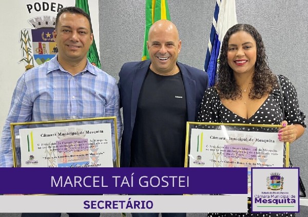 O vereador Marcel Taí Gostei, secretário da Mesa, concedeu Título de Cidadão Mesquitense aos Sr. Vlouner Silva Martins e ao Sr. Clayton Silva Martins (in memorian), empresários do ramo de telecomunicações, com empresa estabelecida em Mesquita; contribuindo para geração de empregos na cidade.