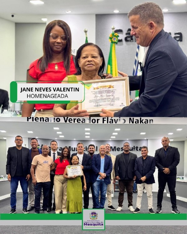 Ainda na mesma ocasião, o vereador Zé Chaleira entregou uma Moção de Congratulações e Aplausos à Sra. Jane Neves Valentin, viúva do "Almir Carteiro", grande personalidade mesquitense que contribuiu ativamente para a emancipação da nossa cidade, além de ter sido fundamental em vários outros avanços. Sua partida precoce no ano passado deixou uma grande lacuna em nossa comunidade.