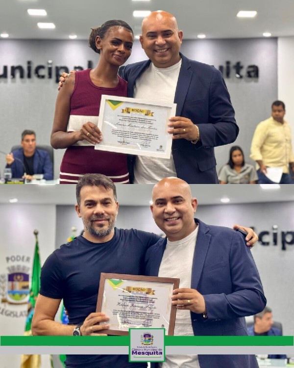 Durante a sessão, o vereador Diogo Talento concedeu uma Moção de Congratulações e Aplausos à Sra. Simone Monteiro dos Santos, servidora desta Casa de Leis, ao Sr. William Ferreira Peixoto e ao Diretor do Teatro Nova Iguaçu, Sr. Rômulo Sales, destacando a importância do fomento à cultura na Baixada Fluminense.