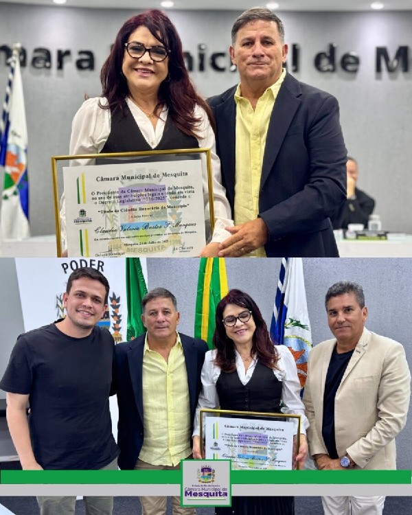 Ainda na mesma Sessão, o vereador Zé Chaleira concedeu o Título de Cidadã Mesquitense à excelentíssima juíza Dra. Claudia Valeria Bastos Fernandes Marques, Juíza Federal, Presidente da Comissão de Acessibilidade e Inclusão do TRF da 2ª Região, Diretora do Foro da Subseção de São João de Meriti, Embaixadora da APAE Rio, entre tantas outras qualificações que a tornam uma grande representatividade no Direito e na vida pública. A homenagem se justifica por sua expressiva contribuição para o crescimento e desenvolvimento da nossa cidade.